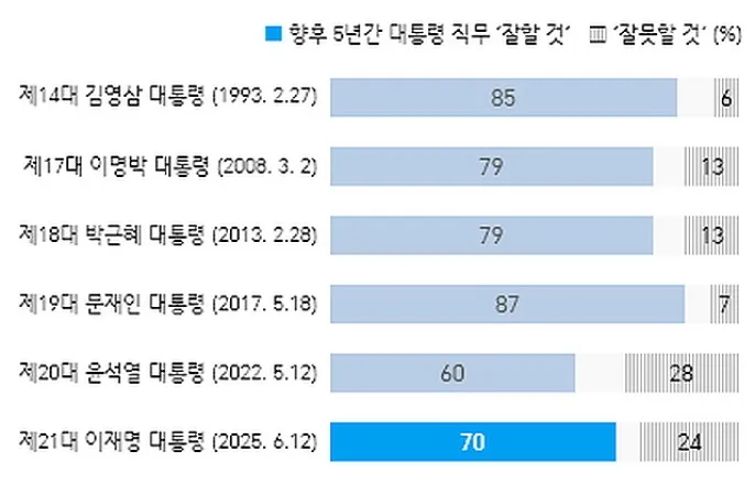 [갤럽] '李대통령 직무 잘할 것' 70%, 尹보다 10%p이상 높아