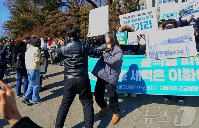 "빨갱이 XX" 멱살잡고, 담 넘고…이대 탄핵 찬반집회 '아수라장'(종합)