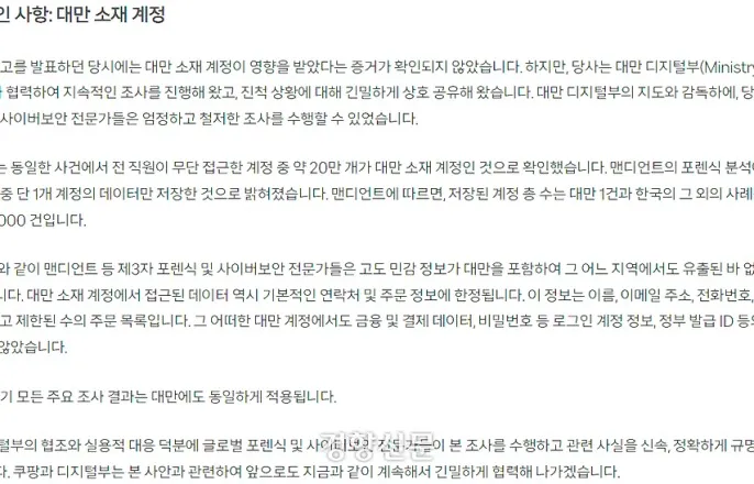 쿠팡 “대만 개인정보도 20만개 털렸다”…3개월 지나 뒤늦게 인정