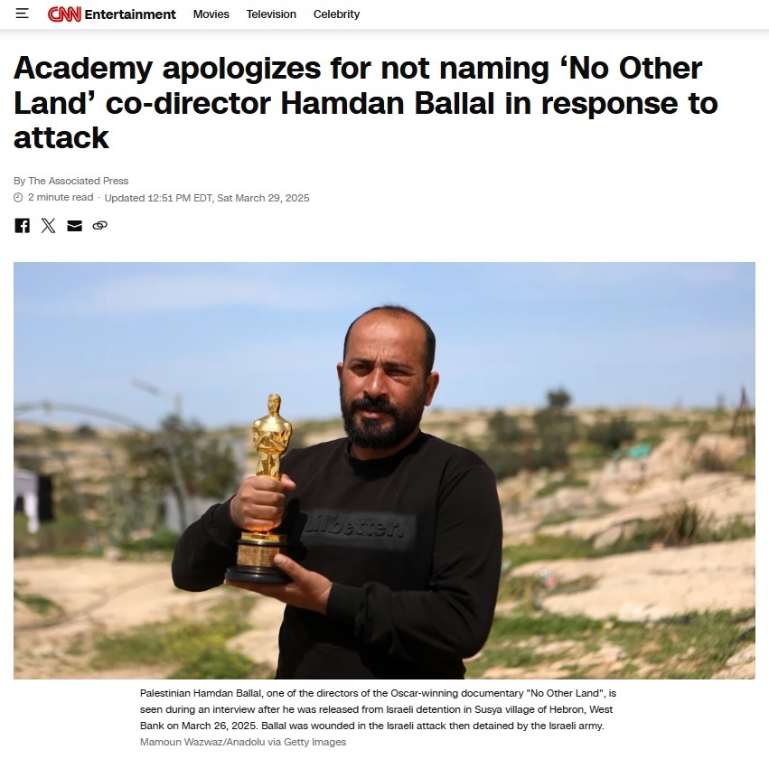 아카데미, '팔레스타인 감독 피습 침묵' 비판에 사과