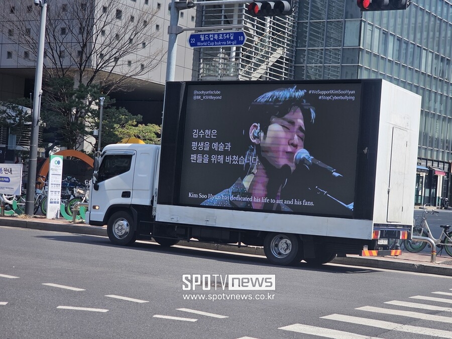 김수현 기자회견 길목에…팬들 "평생 예술 위해 바쳤다" 응원 트럭