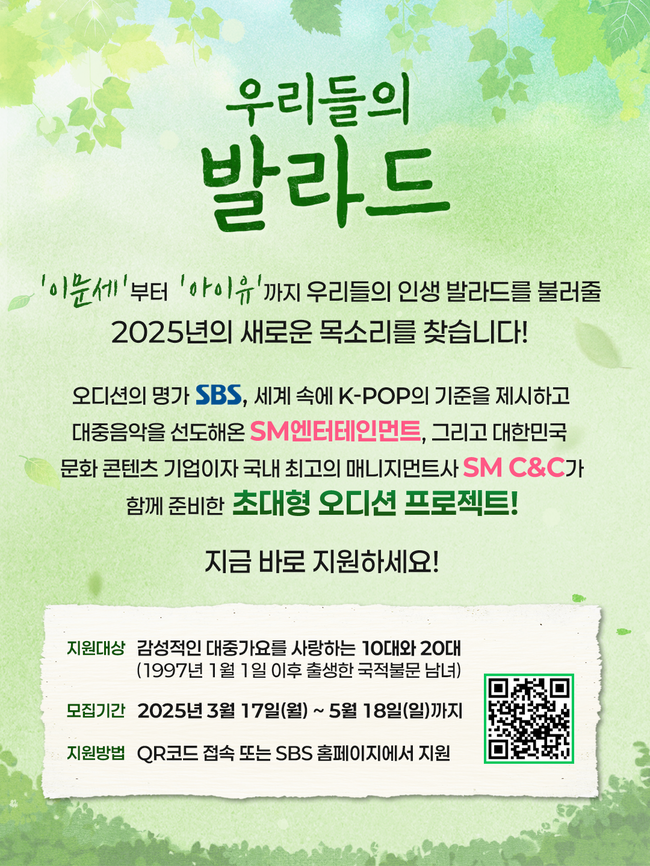“이문세 아이유 찾는다” SBS, SM과 초대형 오디션 ‘우리들의 발라드’ 론칭[공식]