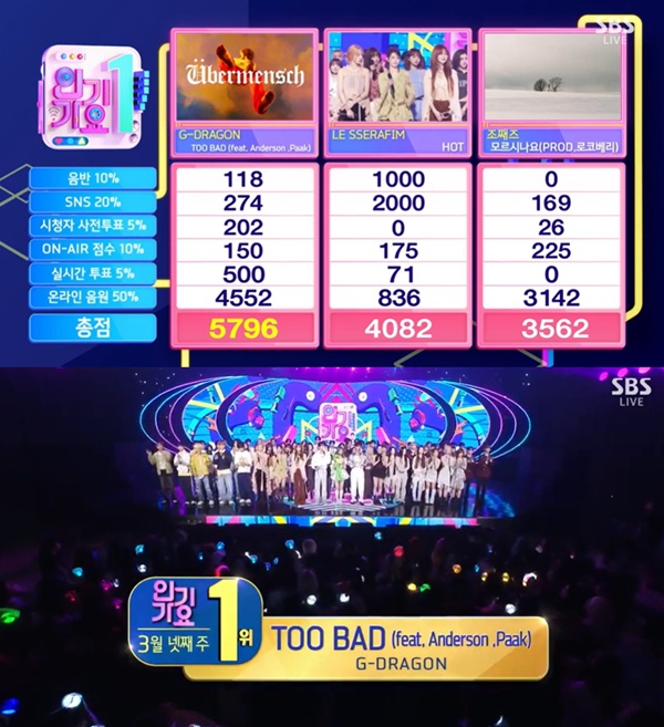 지드래곤, 1위 행진…'투 배드'로 '인기가요' 트리플 크라운 [TV캡처]