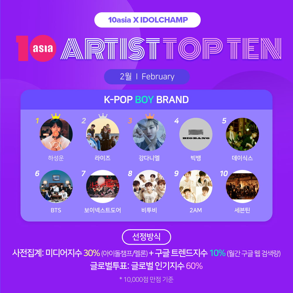 하성운·라이즈·강다니엘, 2월 '아티스트탑텐 K-팝 보이 브랜드' 영예