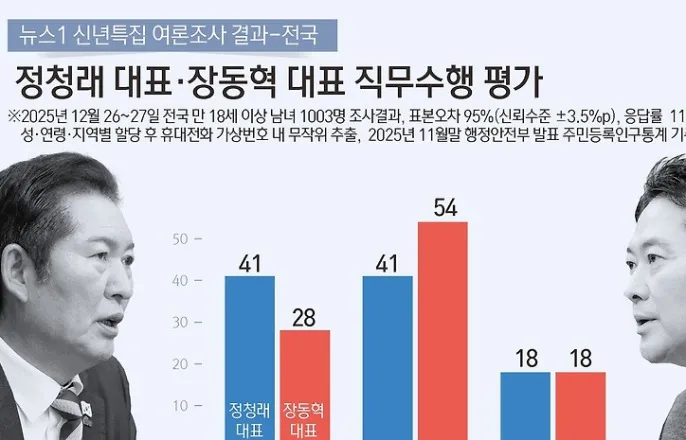 정청래 41%· 장동혁 28%…지선 사령탑 직무평가 엇갈려