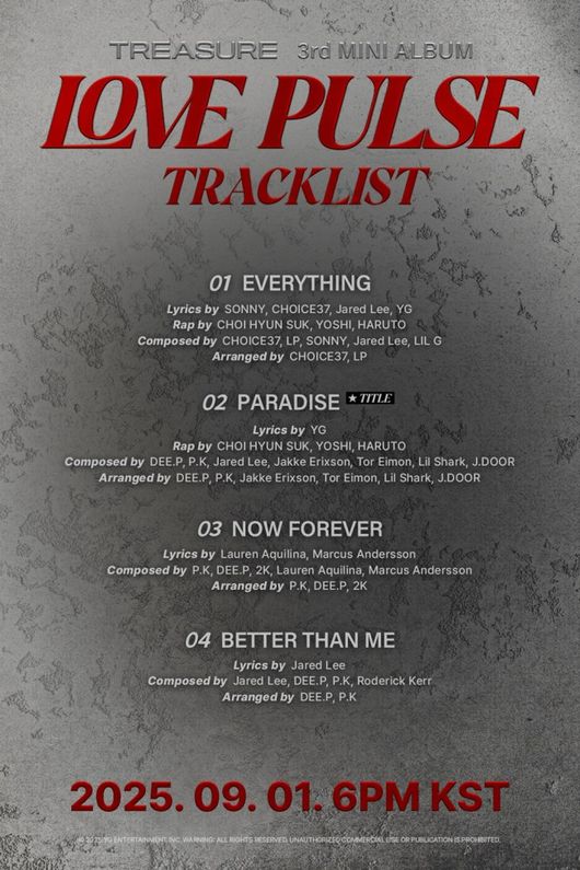 트레저, 'LOVE PULSE' 트랙리스트 공개..YG 막강 프로듀서 군단 의기투합