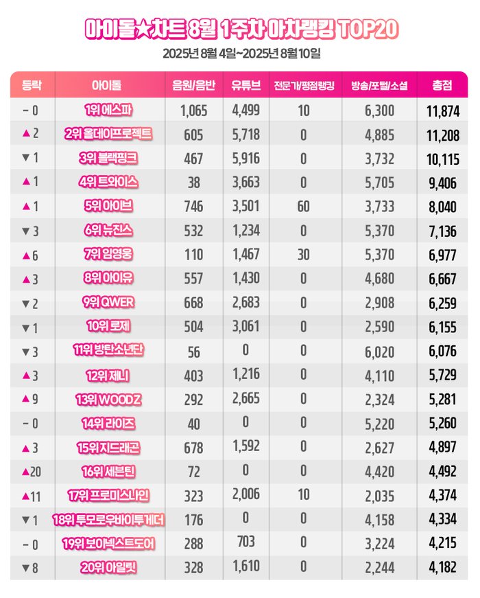 쇠맛 에스파, 아이돌차트 8월1주차 아차랭킹 1위