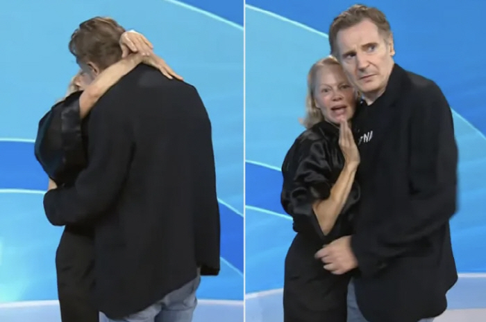 ‘사별’ 리암 니슨·파멜라 앤더슨, 생방송서 진한 키스..“사랑스러운 사람♥”