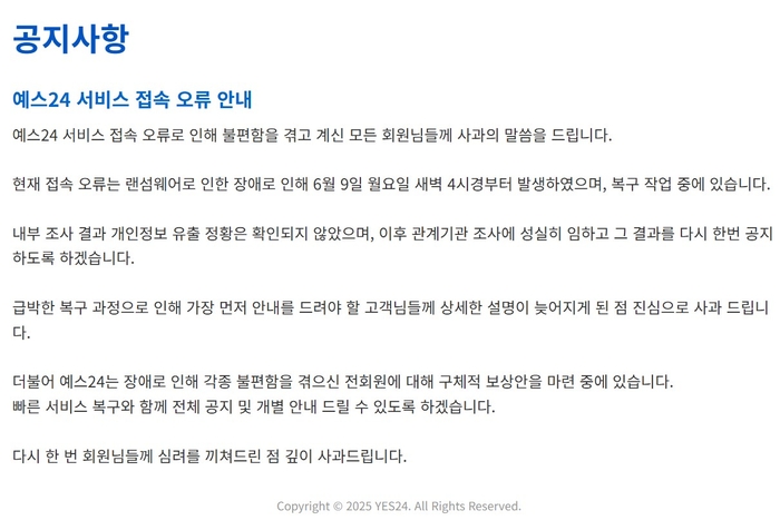 나흘째 서비스 마비 예스24···"KISA와 협력" 거짓말까지