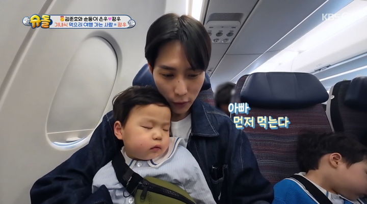'슈돌' 정우, 잠을 이긴 기내식 먹방 "빵 있네!"