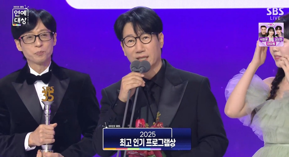‘런닝맨’ 최고 인기 프로그램상‥유재석, 모친상 겪은 지석진 응원 “대상 탔으면” [SBS 연예대상]