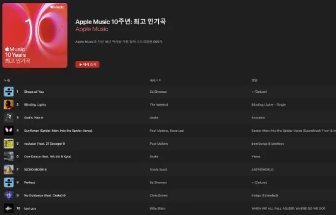 10년간 전 세계 '애플뮤직'서 가장 많이 들은 인기곡은?
